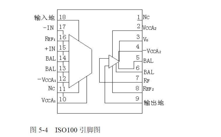 由于環(huán)境試驗箱的工作環(huán)境十分惡劣,因此輸入通道的各個環(huán)節(jié)中存在各種電磁干擾以及共模干擾等不良因素,會造成測量信號嚴重失真,系統(tǒng)不穩(wěn)定等后果。特別是存在強電干擾時會直接影響系統(tǒng)的安全。為此,在輸入通道中常常采用信號隔離措施。常用的方法是采用隔離放大器。這是因為隔離放大器的線性和穩(wěn)定性好,隔離電壓和共模抑制比高,應用電路簡單,頻帶較寬等。本設計中采用了ISO100光耦合隔離放大器保證前向通道的信號傳輸質量ISO100 是一種小型廉價的光耦合隔離放大器。其工作電源為±18V,隔離電壓2500V,輸入電流為±1mA,頻帶寬達60kHz,為18 引腳DIP 組件。引腳圖如圖5-4 所示: